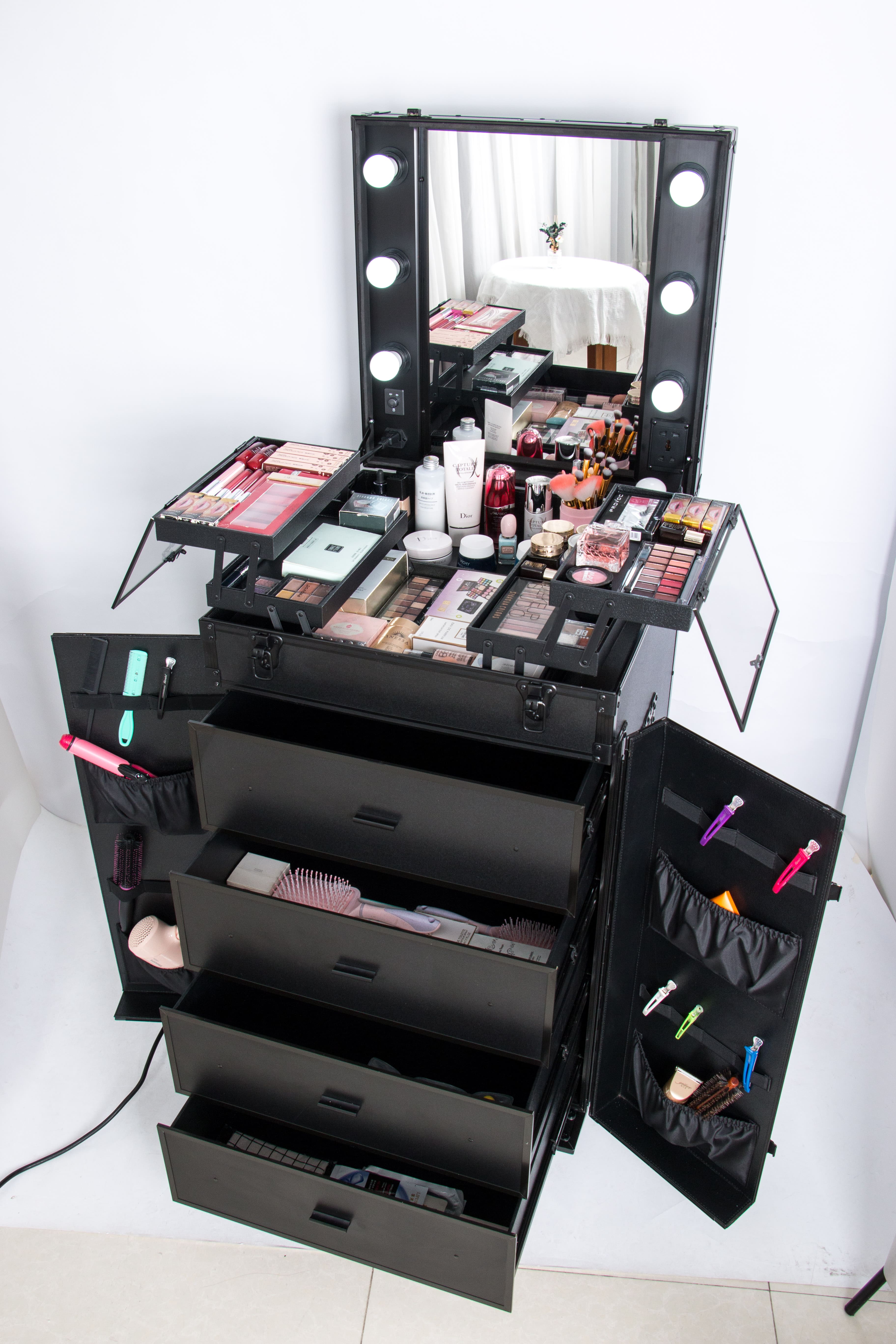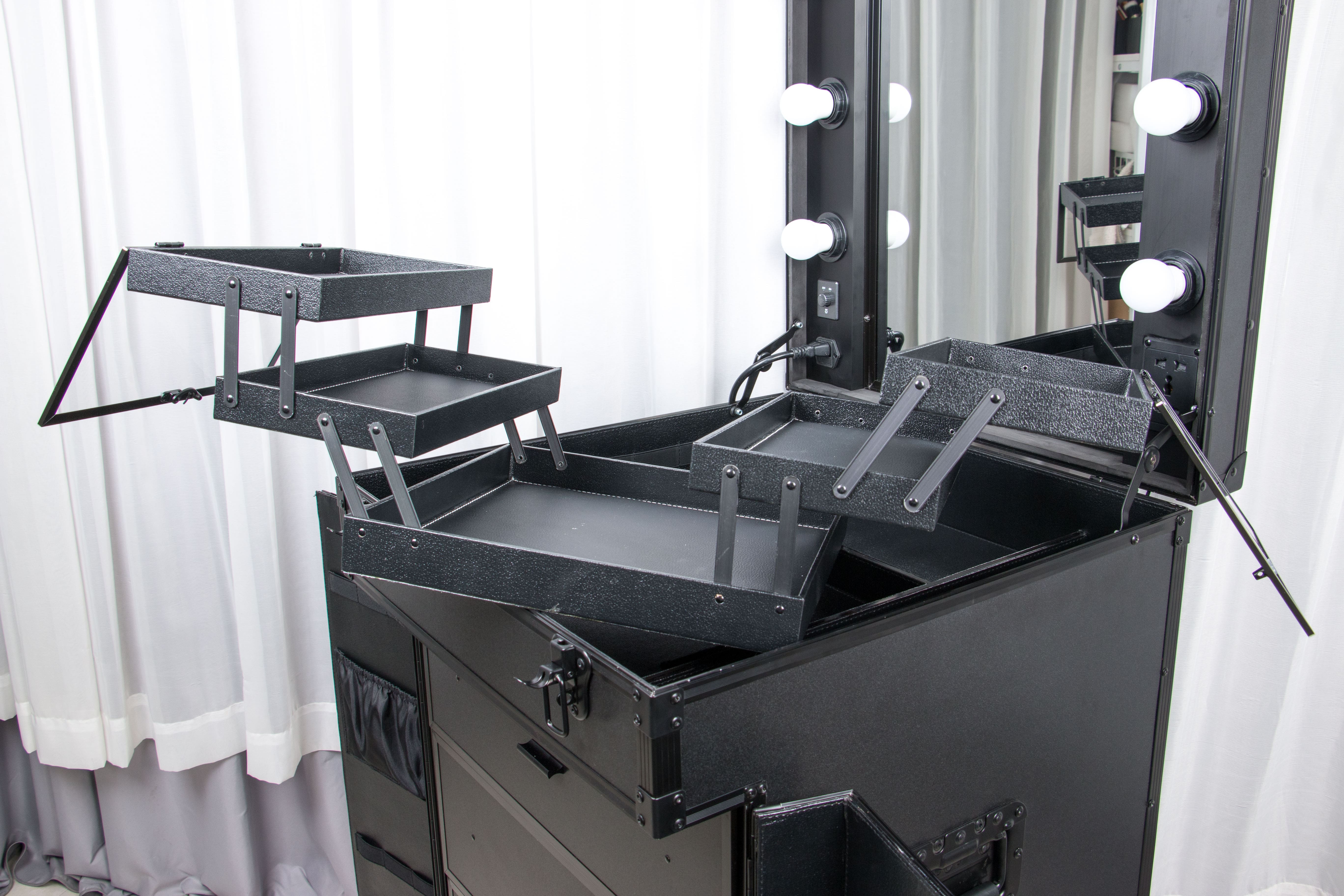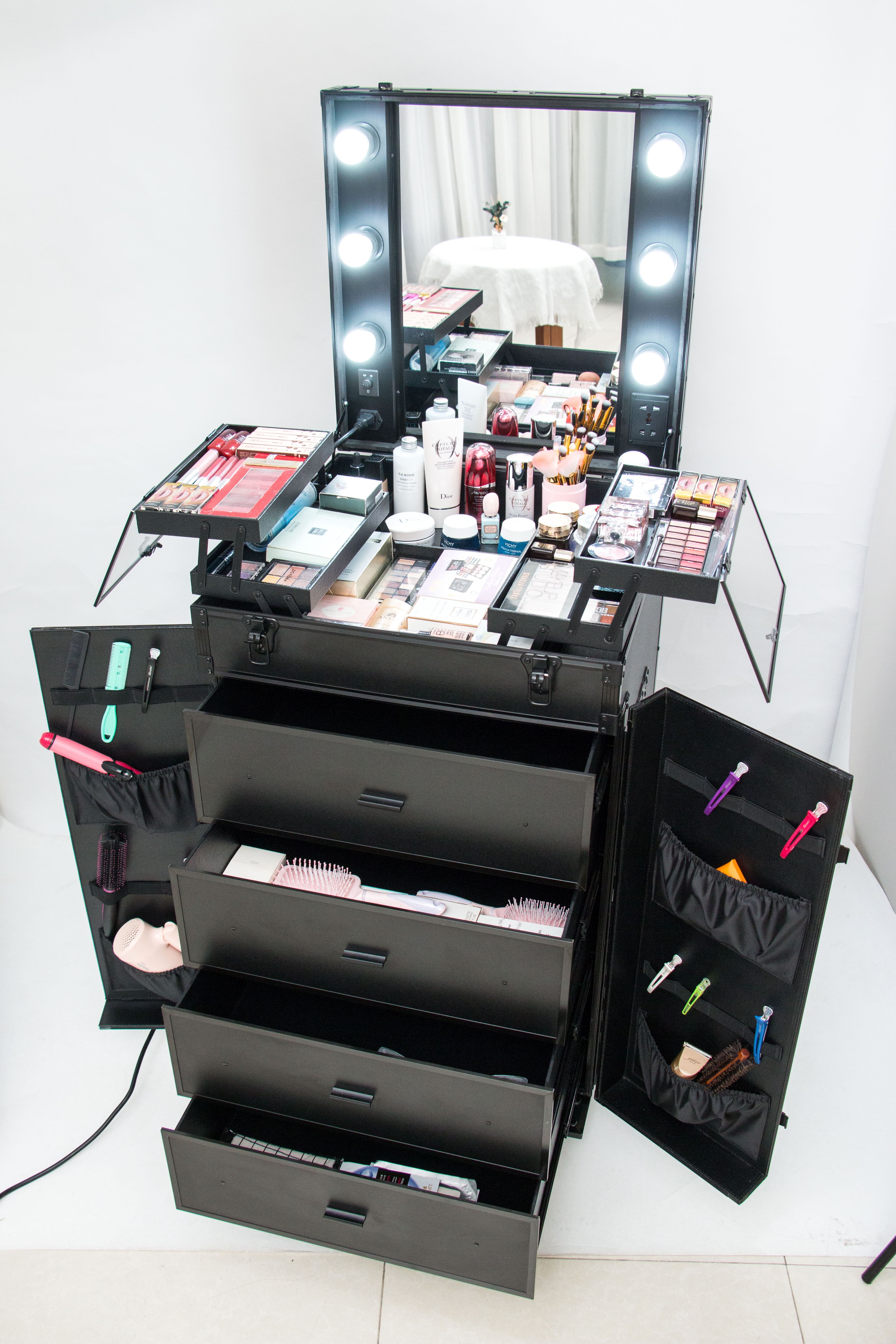 Hair Trolley Case on the go! Has lights and a mirror. Your own on the set on the go station on wheels, with expandable trays. Elastic pockets when opening the doors for plenty of storage. With four big drawers for plenty of room for all your on the go items.