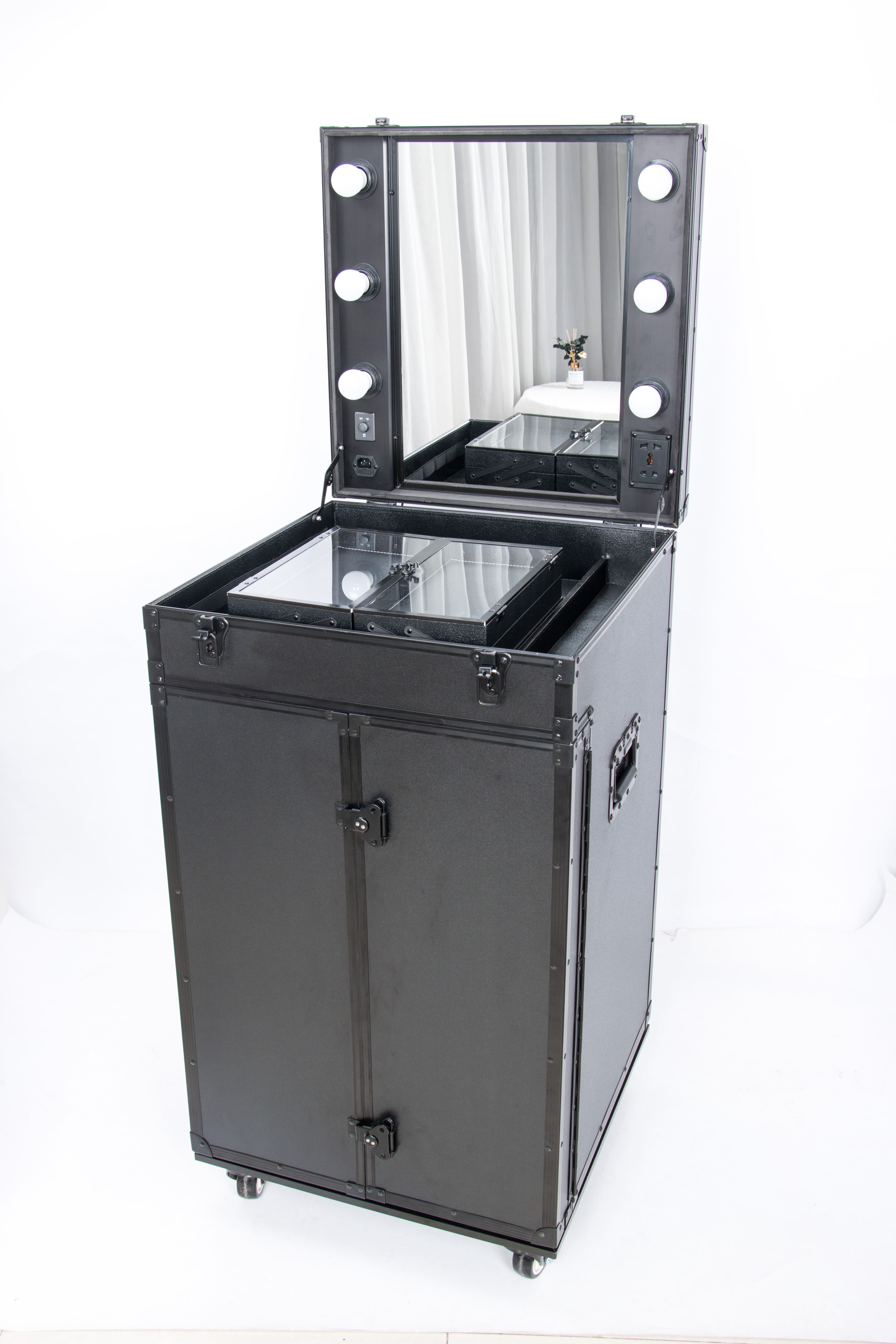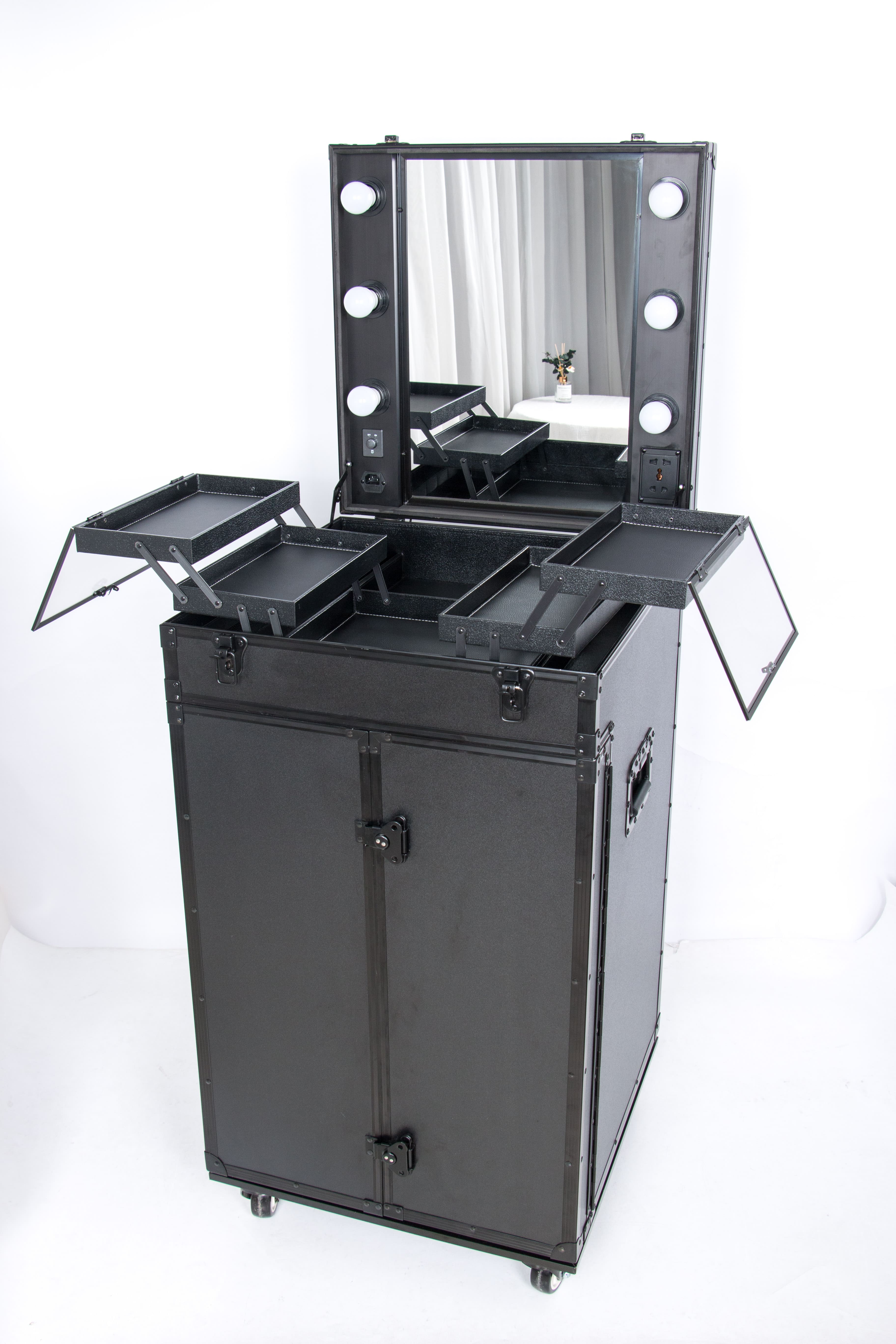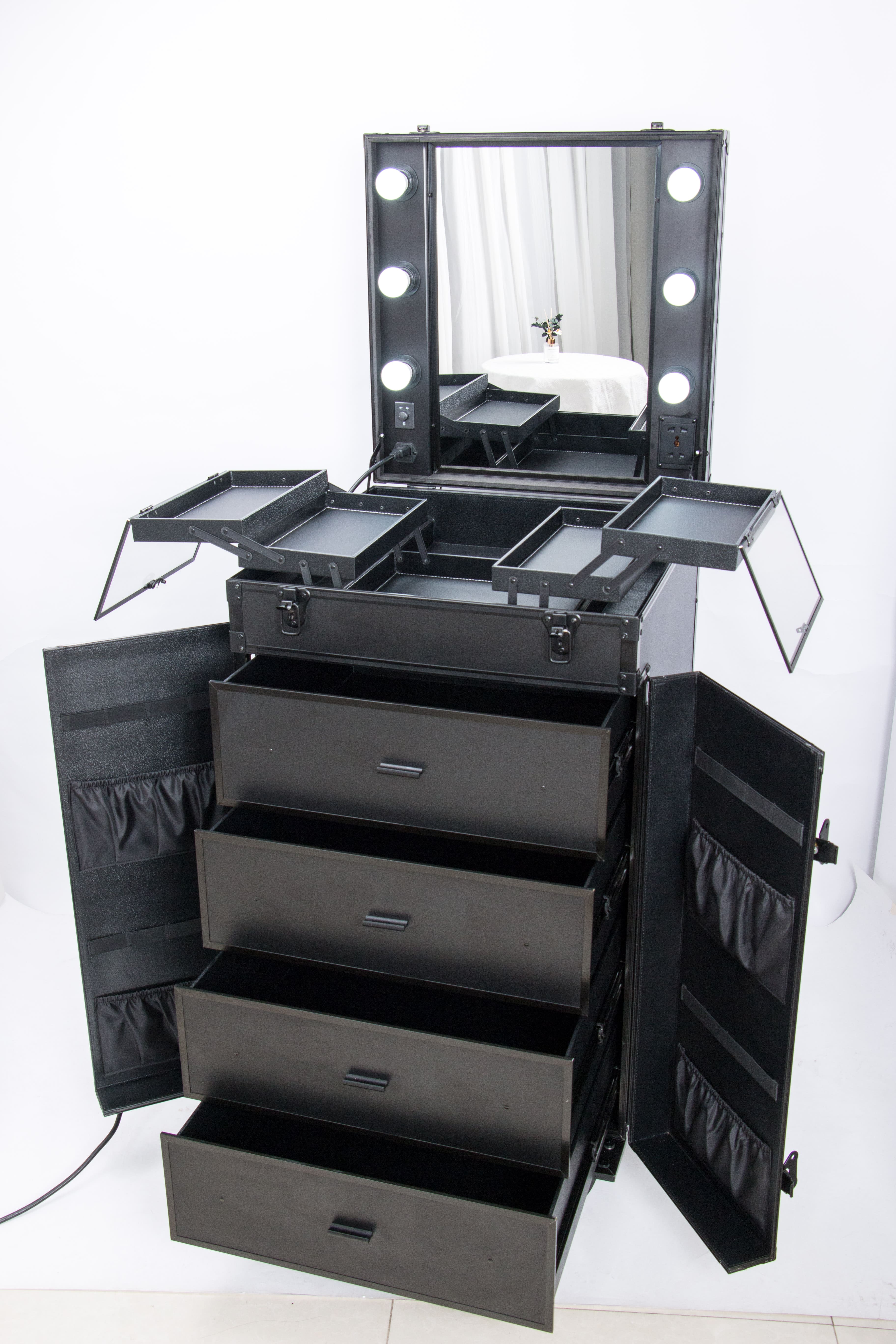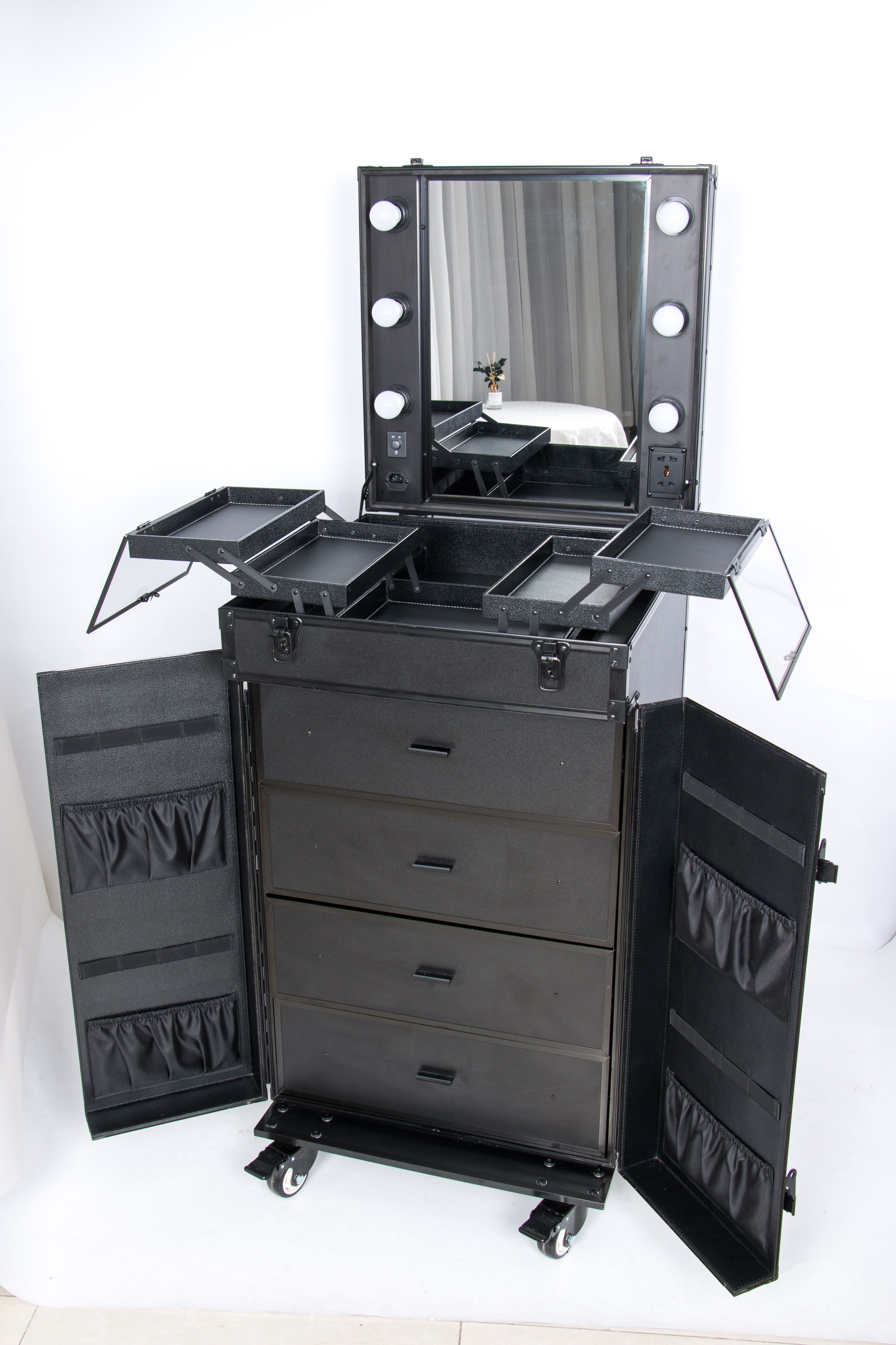 Hair Trolley Case on the go! Has lights and a mirror. Your own on the set on the go station on wheels, with expandable trays. Elastic pockets when opening the doors for plenty of storage. With four big drawers for plenty of room for all your on the go items.