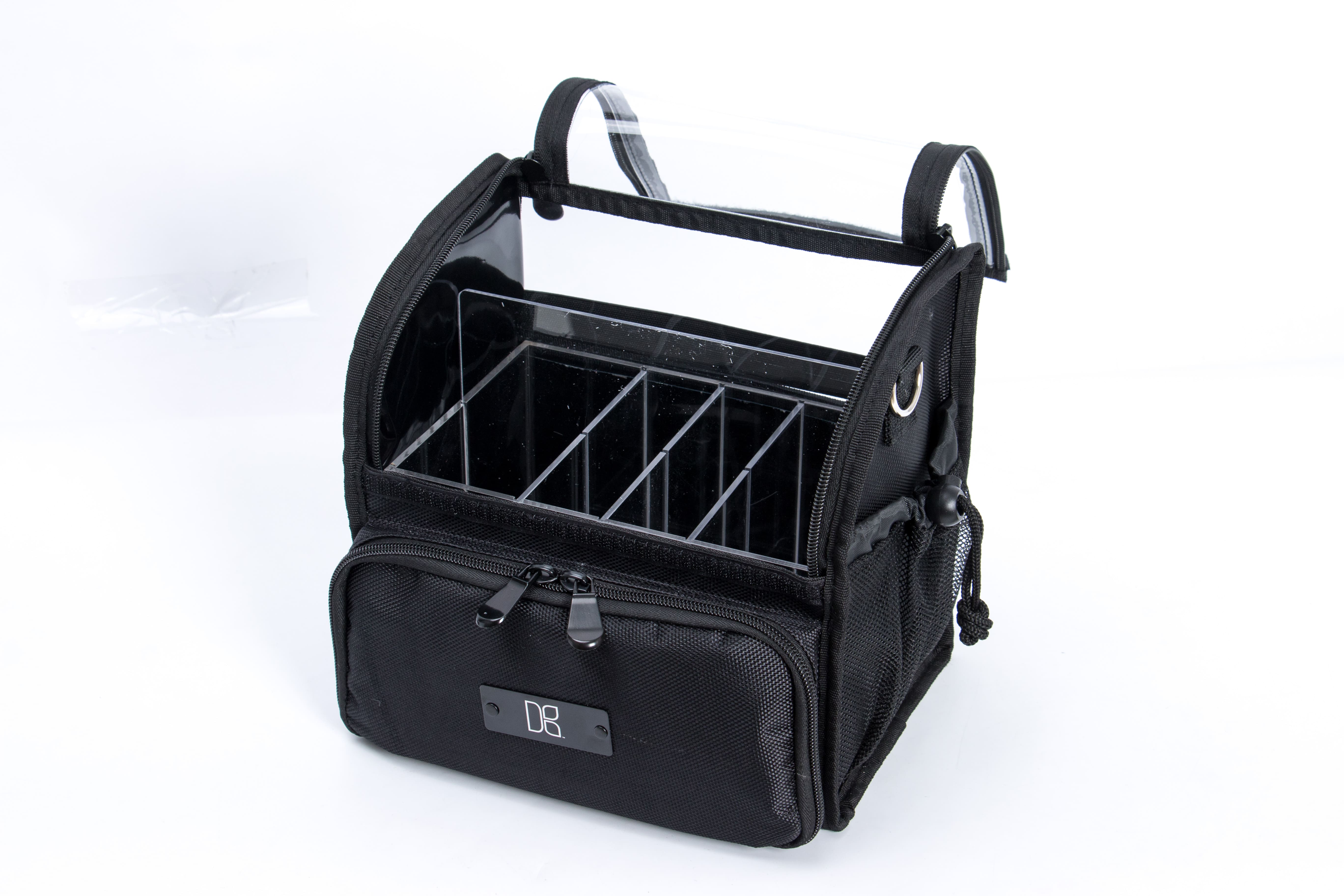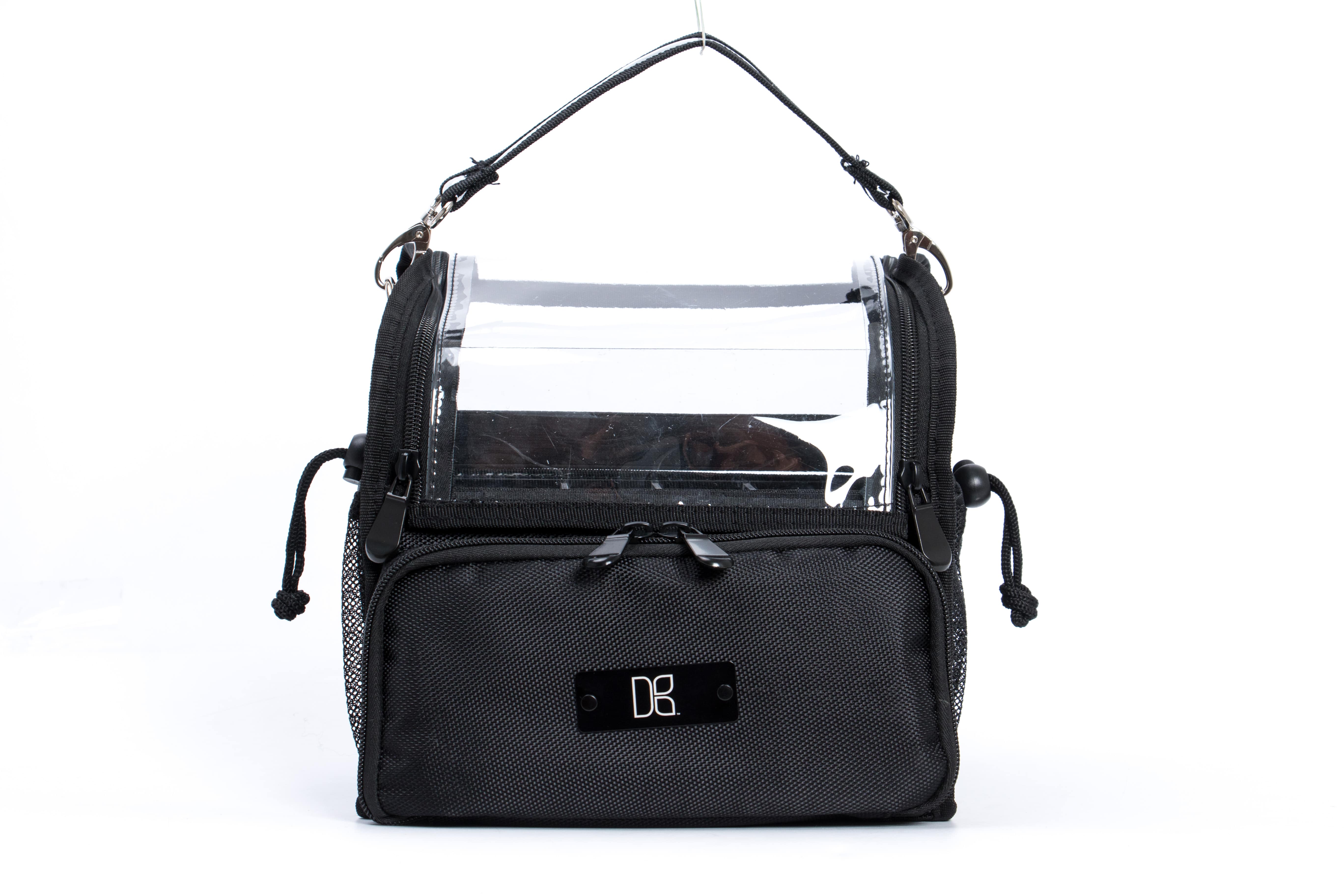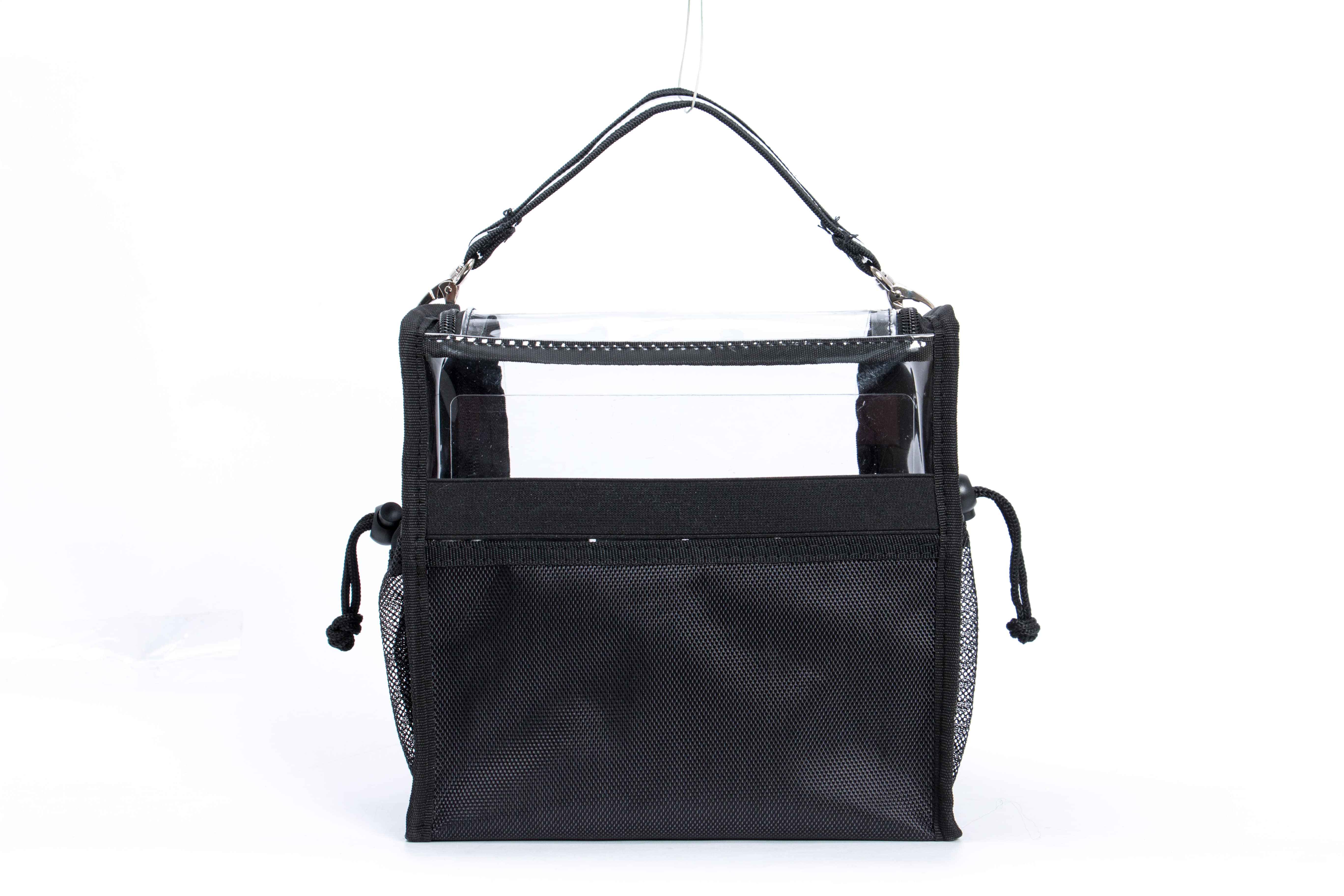 Light weight traveling bag makeup bag. Clear bag can be taken on the airplane using travel size items or even if you need to pack in your suitcase. This bag has two zippers and velcro on the front of the bag for easy access when you are in a hurry. Both sides have adjustable mesh pockets with an elastic belt on the back panel inside with acrylic for storage.