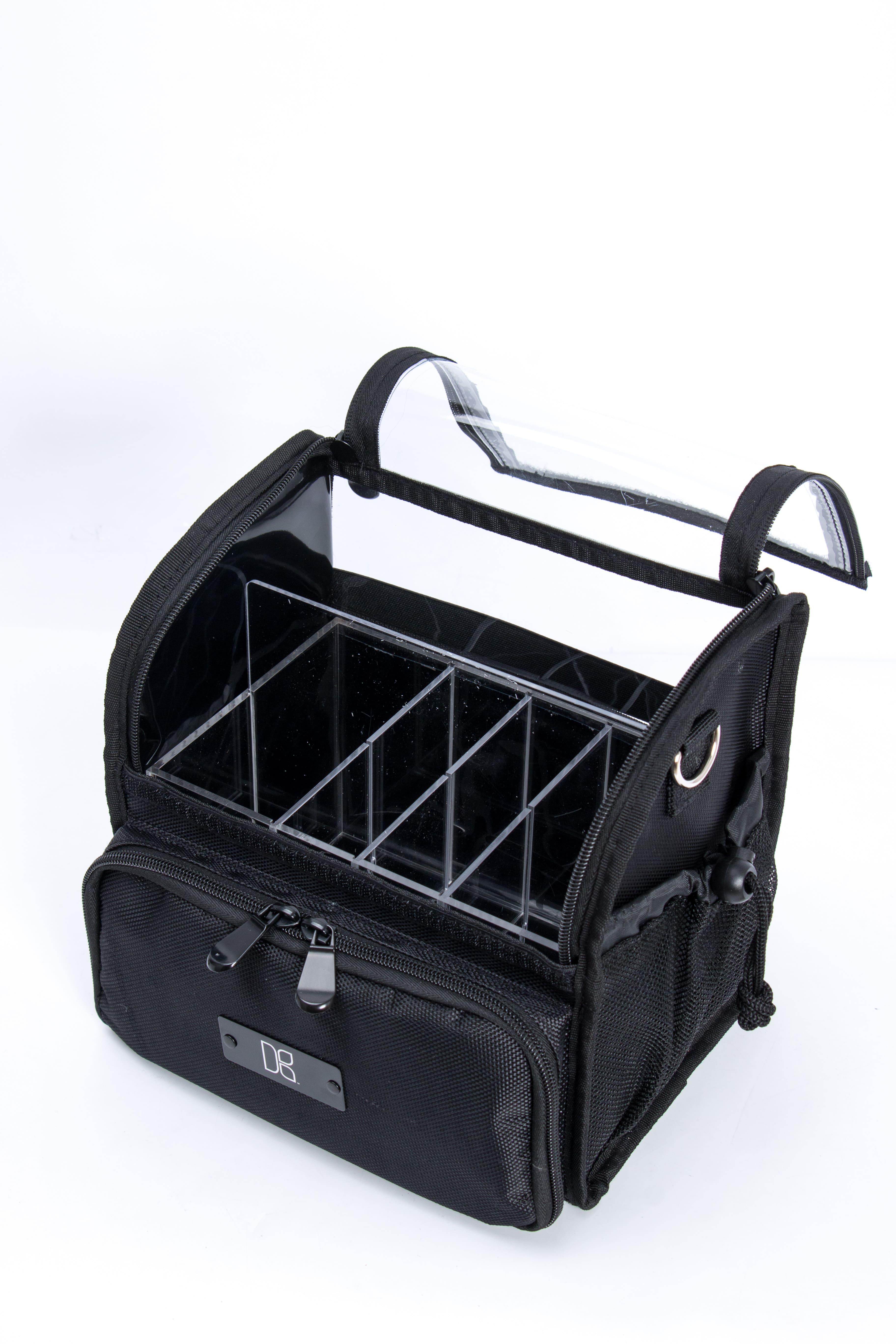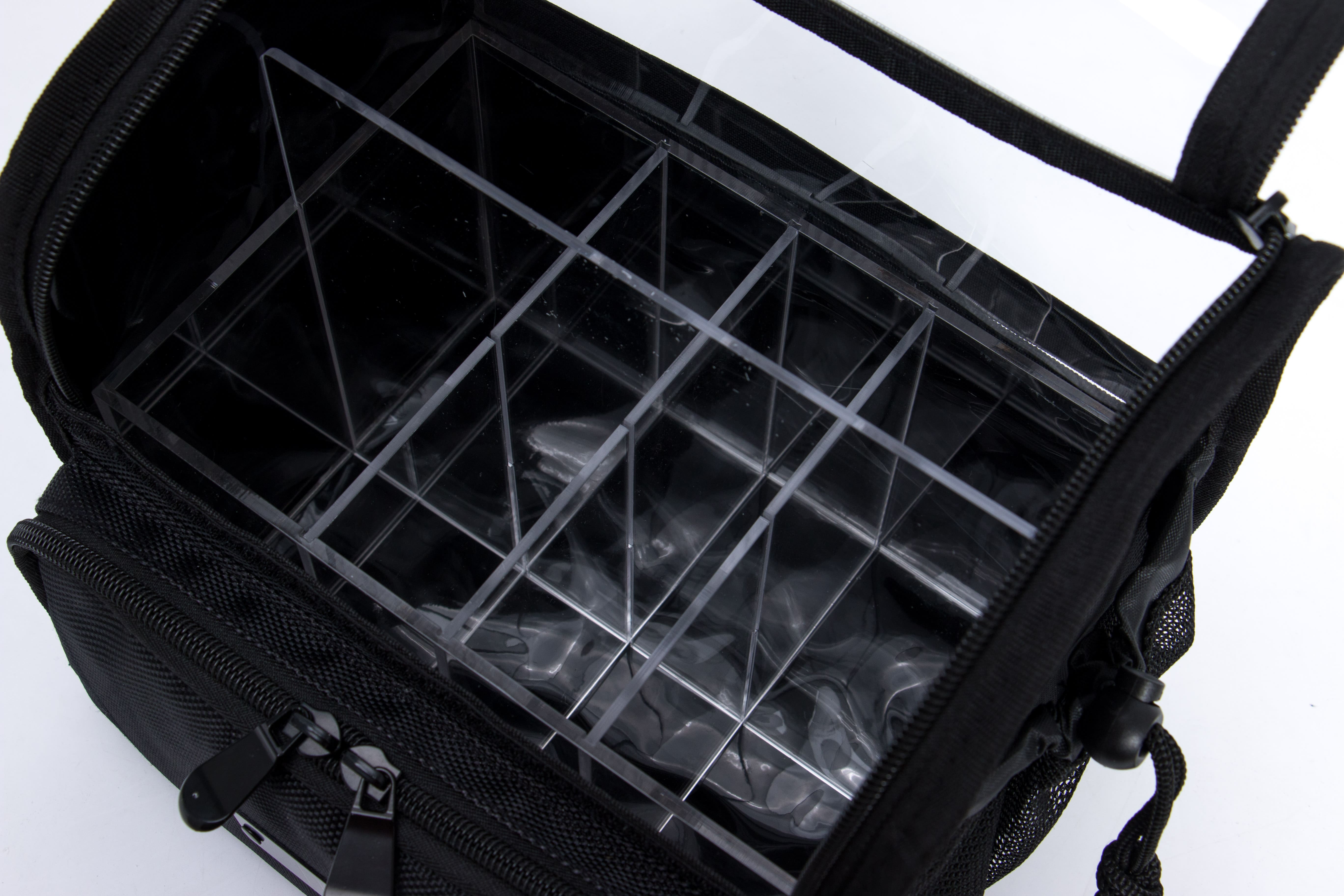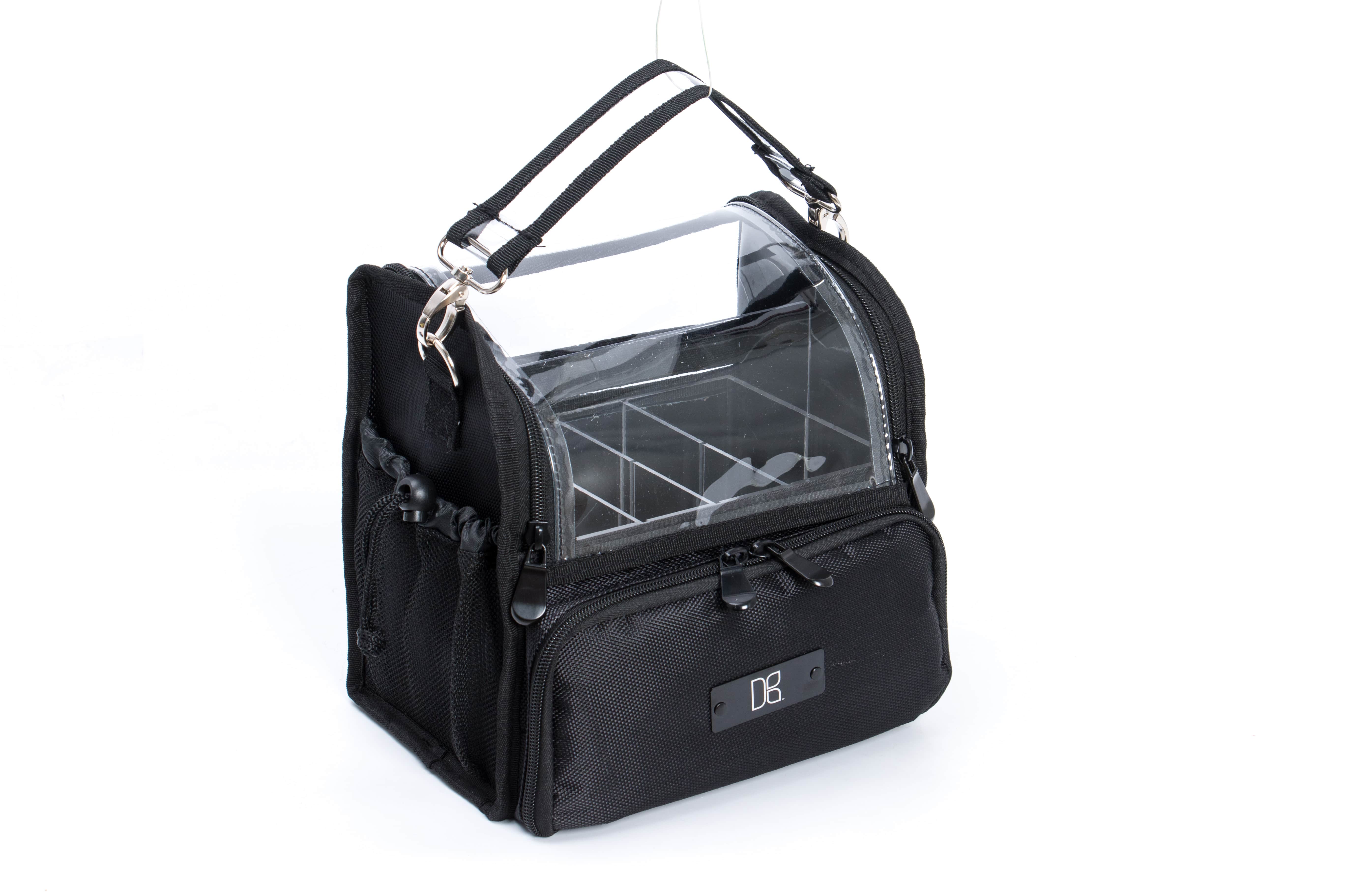 Light weight traveling bag makeup bag. Clear bag can be taken on the airplane using travel size items or even if you need to pack in your suitcase. This bag has two zippers and velcro on the front of the bag for easy access when you are in a hurry. Both sides have adjustable mesh pockets with an elastic belt on the back panel inside with acrylic for storage.